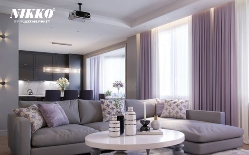 Khi kết hợp với tường màu ghi hoặc hồng nhạt, rèm cửa màu tím nhạt tạo ra một không gian lãng mạn và dễ chịu. Sự tương phản giữa màu tím nhạt và màu ghi hoặc hồng nhạt tạo ra một không gian ấm áp và gần gũi, phản ánh sự tinh tế và nữ tính.